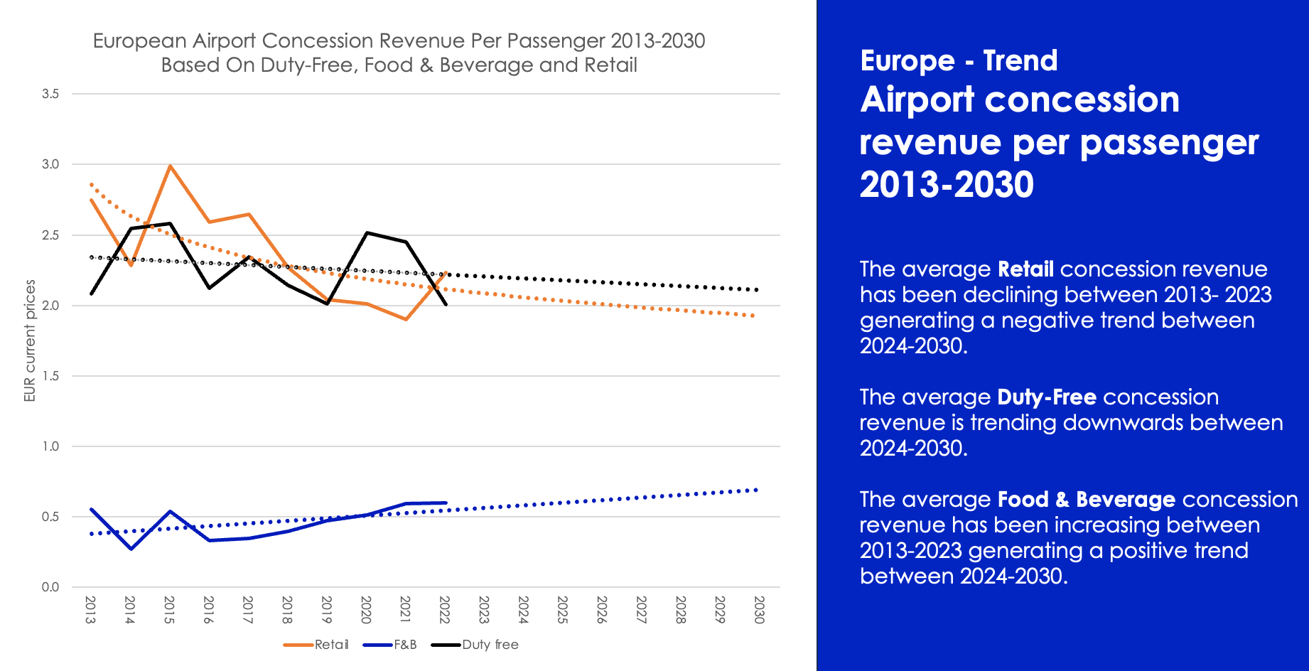 In our previous columns (linked above), we detailed our forecasts for airport concession revenue from 2023 to 2030. It showed that total global retail, F&B and duty-free concession revenue would grow +5.1% (CAGR) over the period with Europe trending below this at +3.6%.